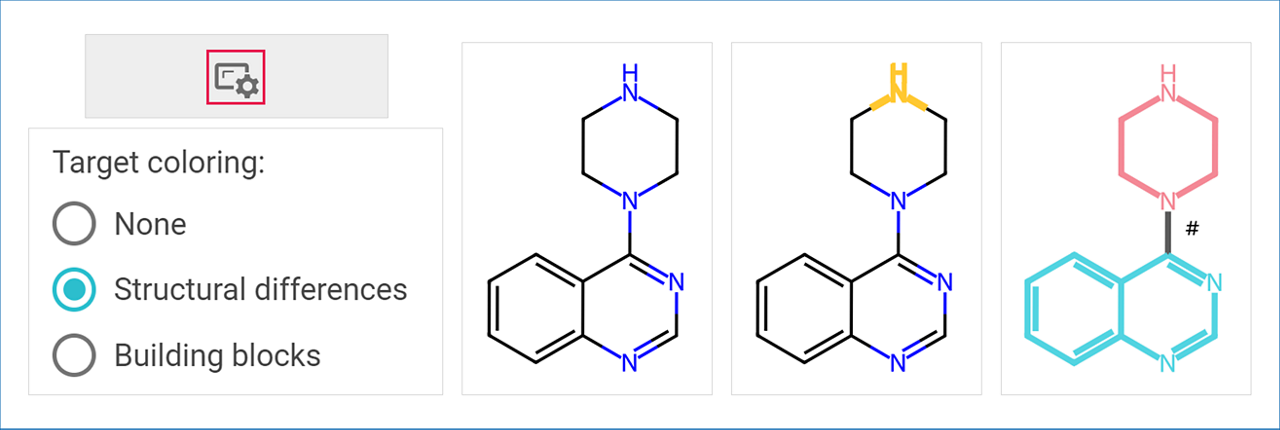 - Building Blocks: Target molecules are colored based on building block contributions to their synthesis. The bonds formed during the synthesis are colored in black and marked with a hashtag sign next to them. The other bonds are colored in sections representing the contributions of the different starting materials to the construction of the molecule.