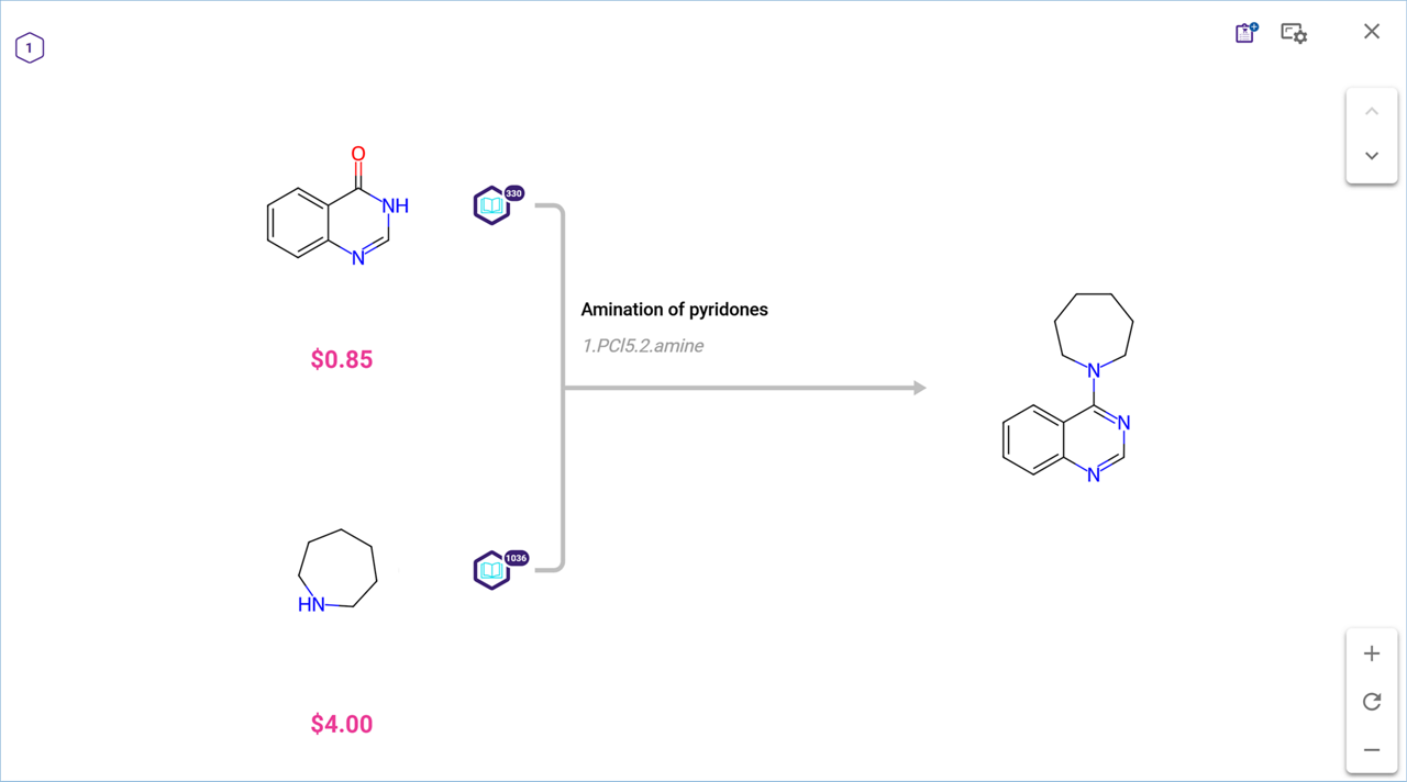 The target molecule number is listed in the upper left corner of the screen. You can move the reaction scheme by dragging it in any direction with your mouse. Zoom in and out using the controls at the lower right of the screen or your mouse wheel. Click the 'Reset' icon to return to the default view.