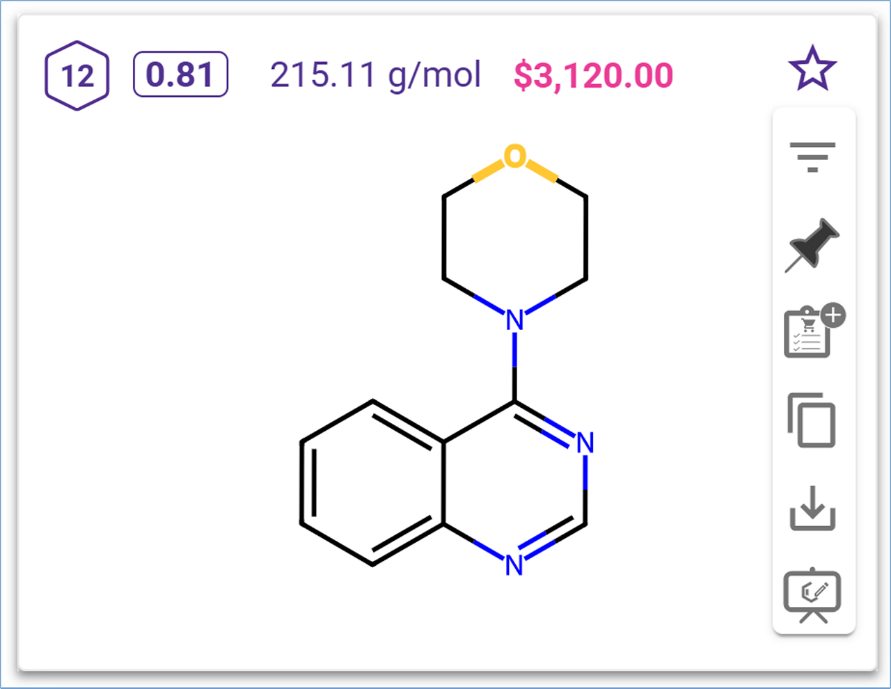 Hover your cursor over a molecule tile to reveal a series of action icons on the right side of the tile. Hover over any icon to see a description. Starting from the top and going downward, the explanations for each analysis action are described below: