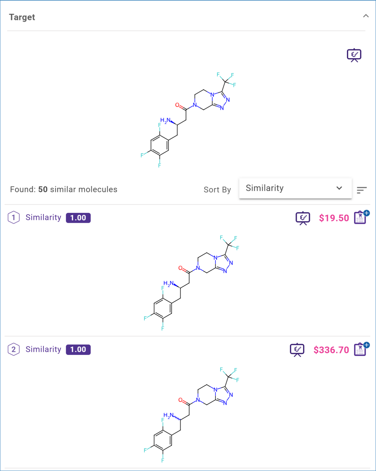 You can also sort the results list by price, in ascending order to see the cheapest compound first, or descending order to start the list with the most expensive ones.