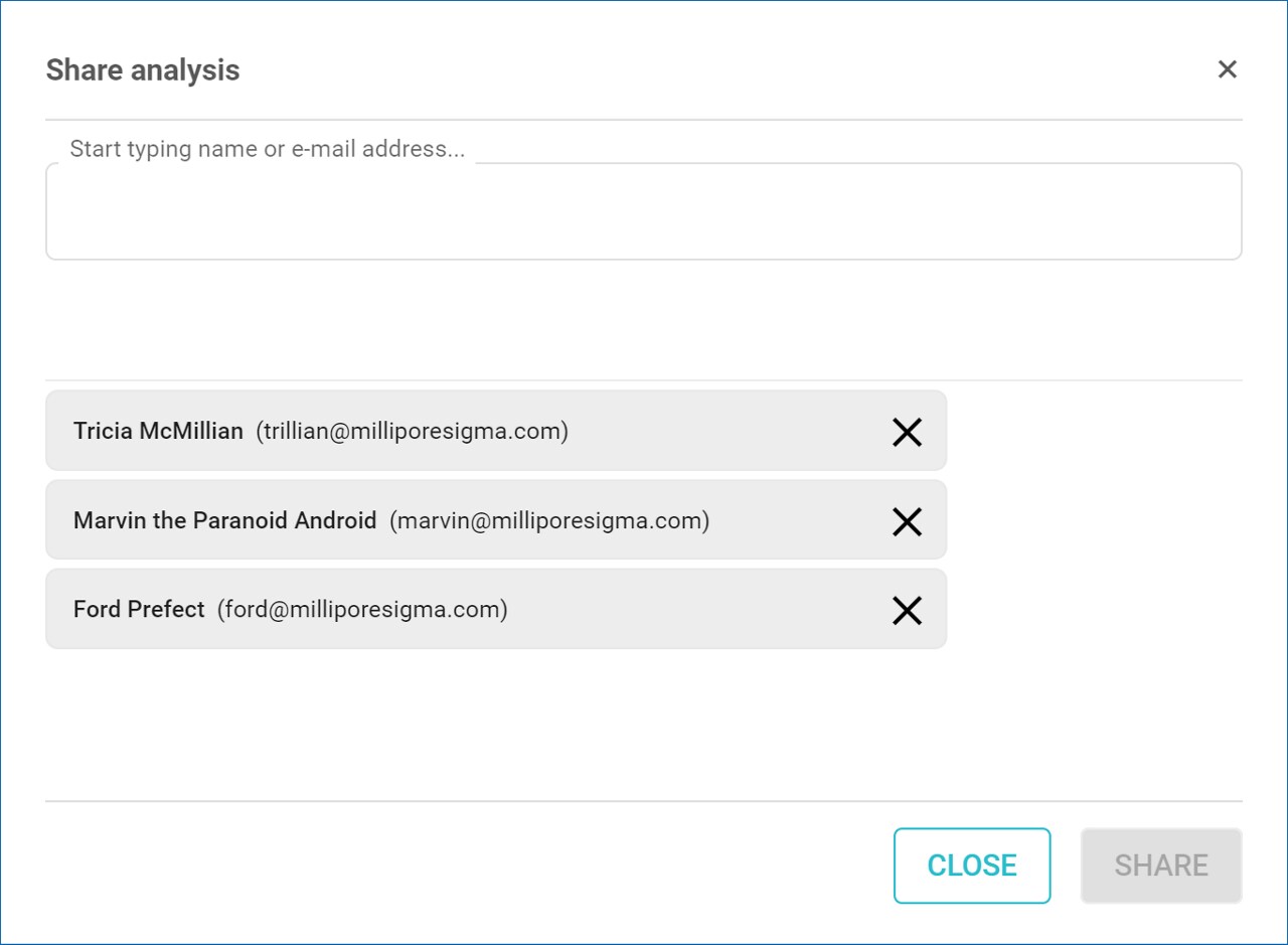 Once shared, the Whiteboard will be accessible to the selected teammates. A list of all current recipients is displayed below the text box. To stop sharing the Whiteboard with a recipient, click the ‘X’ next to their name. Their name will be removed from the list, and they will no longer have access to the Whiteboard. Close the sharing window by clicking the ‘X’ at the top right.