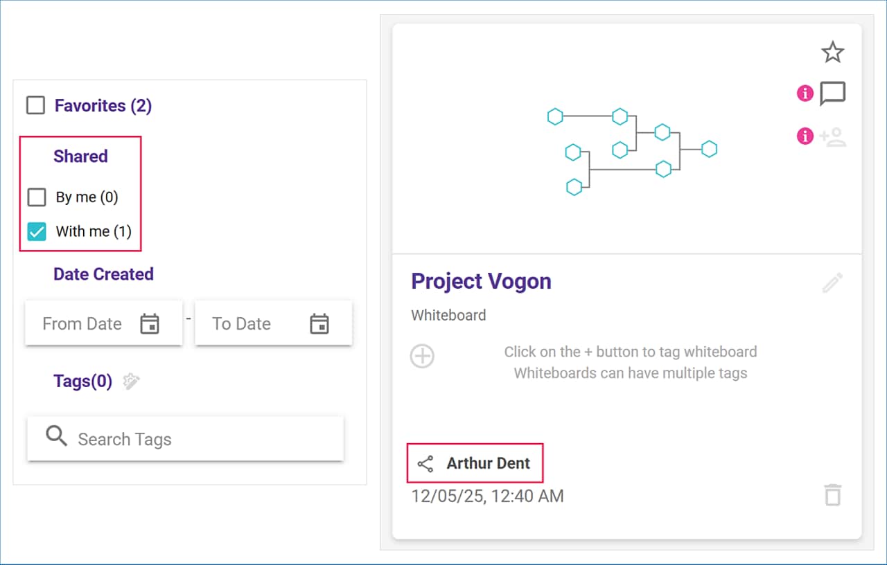 Recipients can access Whiteboards shared with them by selecting ‘Shared with Me’ in the Filter panel. The name of the Whiteboard owner is displayed in the bottom right corner of the Whiteboard tile. Recipients cannot reshare or rename shared Whiteboards. However, they can view comments added to the Whiteboard and contribute their own comments.