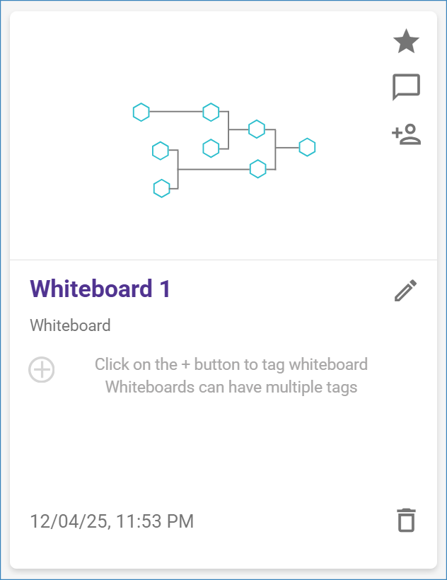 Each whiteboard is represented by a tile displaying the whiteboard name, creation date, and tags. Click on the tile to open the corresponding whiteboard.